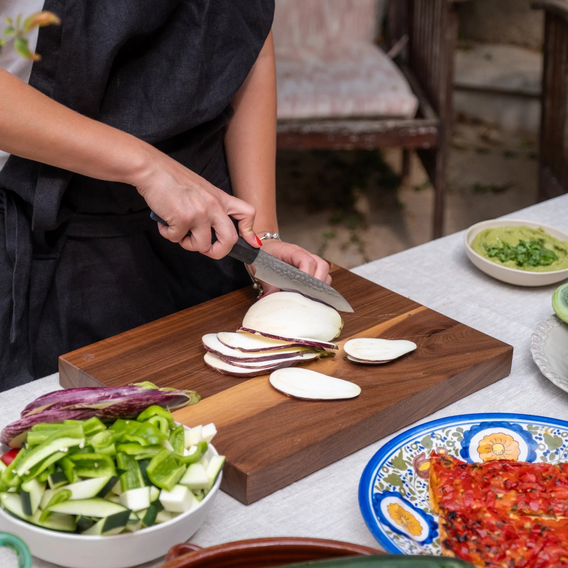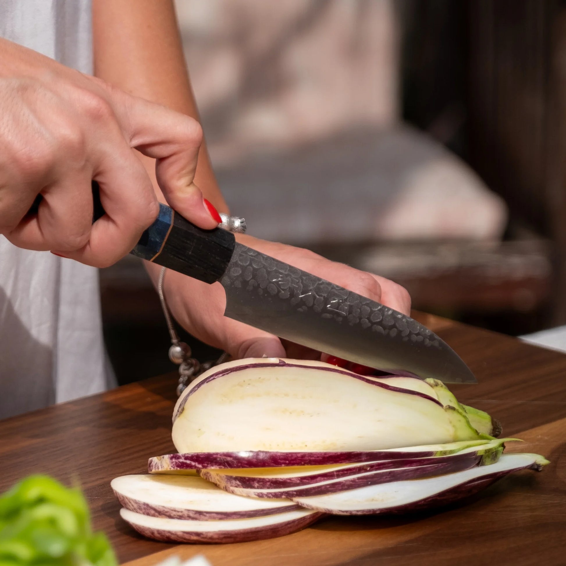 La lame présente également une subtile finition martelée qui ajoute du caractère visuel et aide à réduire l’adhérence des aliments.